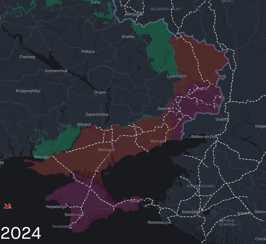 The war in Ukraine has now gone on for longer than the siege of Leningrad, and the frontline has been roughly as static throughout. Anyone who saw the The First Chechen War should have known better than to expect quick success from Russia. The number in dead and wounded and the investment otherwise has far exceeded the vague promises of a “quick war.” Despite this sure embarrassment, the truth is that Russia is “winning,” if only in the sense that Ukraine is surely losing. This victory is exceptionally slow, bloody, and demonstrably contingent on the decline of American and European support (of Ukraine), but it is coming. We can see below that whereas the gains made from February 2023 to 2024 were hardly visible, visible progress has been made since.