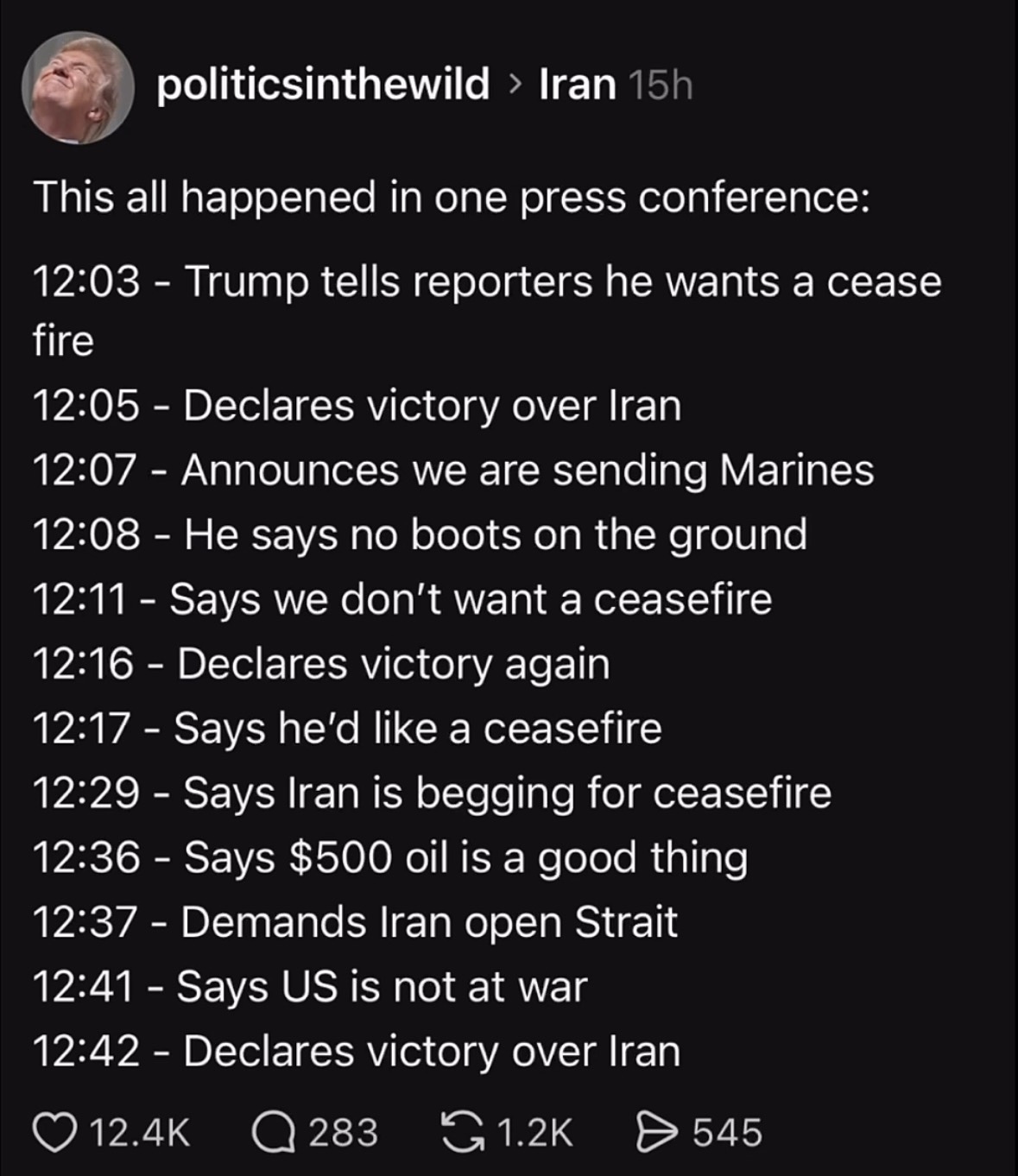 This is not a “war” any more than the (more brief) exchange of fire last summer was. There simply will not be Americans landing en masse on the shores of Iran, because that is not practical. There are constant tales being spun that exactly this will happen any day now, but it will not. Perhaps Kharg island or some other more targeted engagement will take place, but even that is seriously dubious. I am sure Trump dreams of launching a raid on Tehran like he did on Caracas, but Iran is not to be played like Venezuela. Rather, Trump appears intent on bombing Iran into doing his nebulous bidding, which will not happen, for reasons we have described. Iran is a real country. As this does not happen, Trump will eventually stop and declare victory anyways. I envision that backroom talks will boil down to bombing and threatening Iran until the strait is reopened and declaring victory when that occurs. Given that the Iranian navy will be at least partly sunk while the United States retains its fleet, the cope-addled conclusion will be that the United States must have won. The White House has already begun preparing for this by releasing a “timeline” detailing their much more limited intentions, despite those obviously conflicting with Trump’s own statements these past weeks.