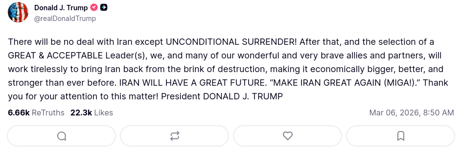 Here is a fun exercise to know if a military operation is going well: count the number of times that the (stated) intended outcomes and investment have changed. At the onset of this conflict, the White House declared that it was seeking “UNCONDITIONAL SURRENDER!” from Tehran and expected the conflict to resolve quickly; within days. The various talking heads and lackeys of the MAGA4 movement, who for so long praised Trump’s strength as peace-maker, made sure to urgently parrot this more hawkish stance5. Fast forward and the new line is that the President does not really need the Iranians to actually surrender, and can himself determine when the increasingly vague objectives of this operation have been met. In other words, Trump decides when Iran has “unconditionally surrendered.” By this, Trump is made arbiter, wielding the power to determine when the war ends, no matter the agency of Iran. This is the kind of fantasy that one concocts when in denial. It is the exact kind of thing that would be expected of Trump in this exact circumstance, but that does not make it any less stupid. Worse, it does not make it unique to him.